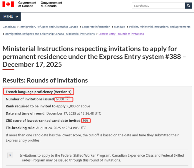 周三(12月17日),IRCC进行了最新一轮的法语能力类别(French-language proficiency)抽选:
