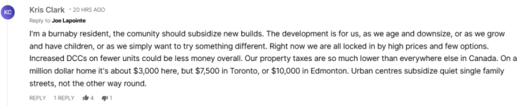 与此同时,也有本拿比居民持相反意见。他认为社区应该补贴新建房屋,因为新增住房最终是为了社区自己使用——无论是年纪增长后想缩小住房面积、家庭成员增多需要更大空间,或只是希望尝试不同居住方式。现在高房价与有限选择让所有人都受困。即便对少量房屋提高 DCC,整体花费可能反而更低。更关键的是,本拿比的房产税在全加拿大都偏低:一栋百万加元的房子的物业税约 3000 加元,而在多伦多约 7500.加拿大其他城市如埃德蒙顿甚至达到 10000.他认为,实际情况是城市中心在补贴安静的独立屋街区,而不是反过来。