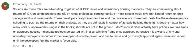 有网友批评说,一些人实际上是在主张取消所有 DCC 和配套住房要求。他们抱怨公寓项目 12% 的收益率、租赁项目 6% 的收益率太低,但对普通人来说,这其实已经比储蓄或债券投资理想得多。评论者指出,开发商“实际上把城市和省政府都握在手里”,共同抬高项目收益率,通过拖慢开工速度掌控供应。即便大量住房在书面上获批,也迟迟不开工。他质疑城市是否该设定批准后的开工时限,否则项目被搁置、又得重新修改并再审批,造成城市资源和纳税人的持续浪费,直到开发商觉得市场条件足够有利才愿意推进。