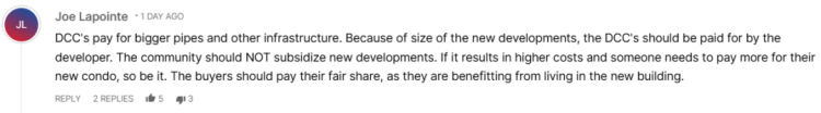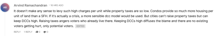 还有观点批评现行制度不合理:在房产税如此低的情况下,却对每套公寓征收如此高额的 DCC 不合逻辑。公寓在相同土地上的供房密度远高于独立屋。如果政府真视现在为“住房危机”,应该采用更合理的 DCC 模型。但城市不愿提高房产税以避免激怒现有选民,却可以维持高额 DCC,让成本落在未来购房者身上。