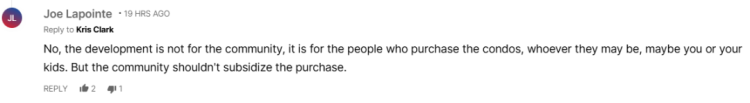 有人直言:“开发不是为了社区,而是为了购买公寓的人——可能是你,也可能是你的孩子。社区没有理由为他们的购买埋单。”