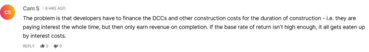 也有人提出开发商的困难:DCC 和其他建设费用都需要在施工期间先行垫付,开发商必须为这些成本支付利息,但只有在项目完工后才能获得收入。如果基础收益率太低,利润很容易被利息吞掉。