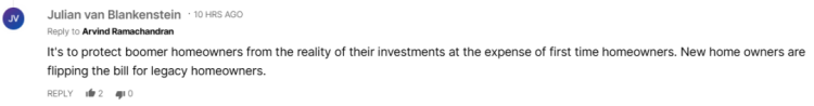 一些评论还认为,这实际上是在保护婴儿潮一代的房主,使他们不用面对自身资产增值的现实,却让首次购房者承担更多成本——“新房主是在为老房主买单”。