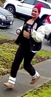 另外一名女性嫌疑人的特点有:非常独特的亮粉色头发、黑色外套、白色袖子、黑色兜帽、深色露脐上衣、黑色裤子、米色和白色鞋子。