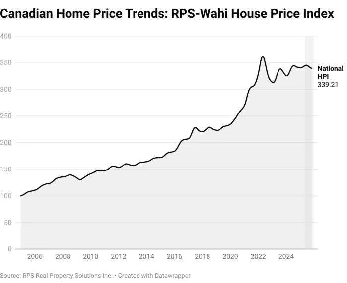 房地产平台Wahi和加拿大房产估值服务提供商Real Property Solutions (RPS)联合发布了2025年11月的月度房价指数。该指数追踪了全国1000多个城镇的实际房价,并展示了房价随时间的变化。