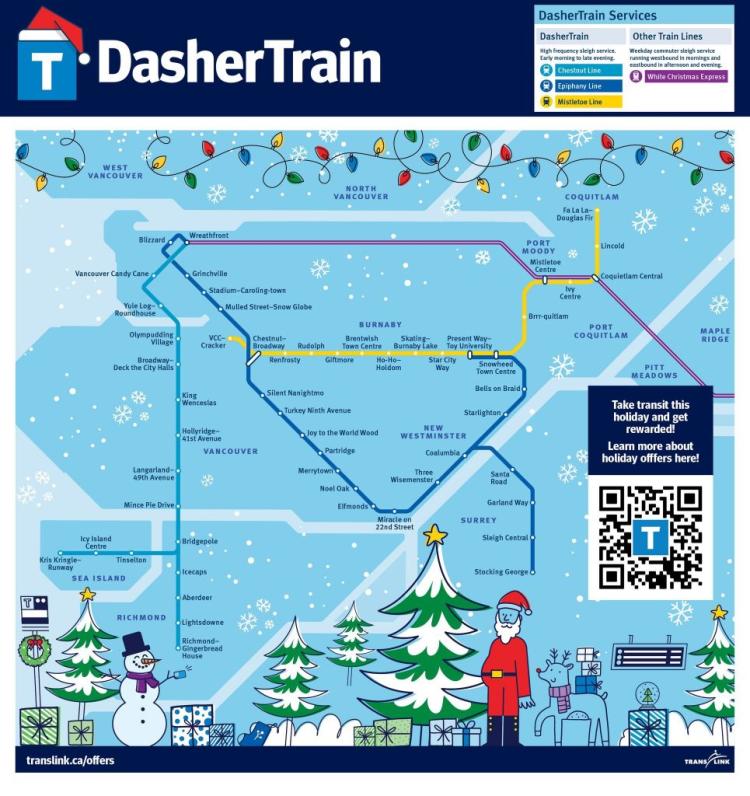 圣诞节当天,大温运输联网(TransLink)再次为天车线路图换上了“DasherTrain”新装。