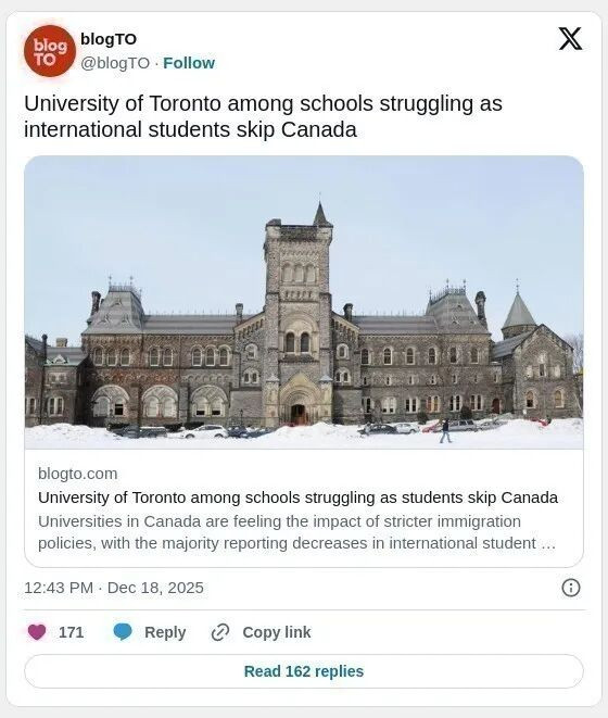 加拿大高校正感受到移民政策收紧带来的冲击,多数学校报告国际学生入学率下降。