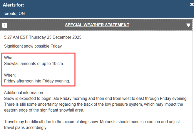 环境部已经针对安省南部发布了黄色和灰色天气预警。从周五下午到晚上,大多伦多地区将有最多10厘米的降雪。不过,环境部也表示,低压系统的具体路径仍存在一定不确定性。