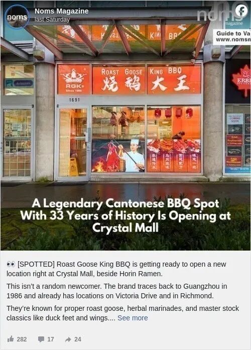 拥有30多年历史的传奇粤式烧腊店—烧鹅大王(Roast Goose King BBQ) 在本那比的丽晶开了一家新店,而且已经悄然开业啦。