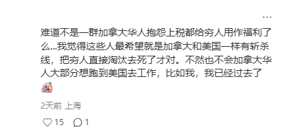 更有润去美国的网友补刀:“难道不是一群华人抱怨税都给穷人当福利?这些人就希望加拿大有斩杀线淘汰穷人,不然也不会往美国跑 —— 比如我,已经过去了。”