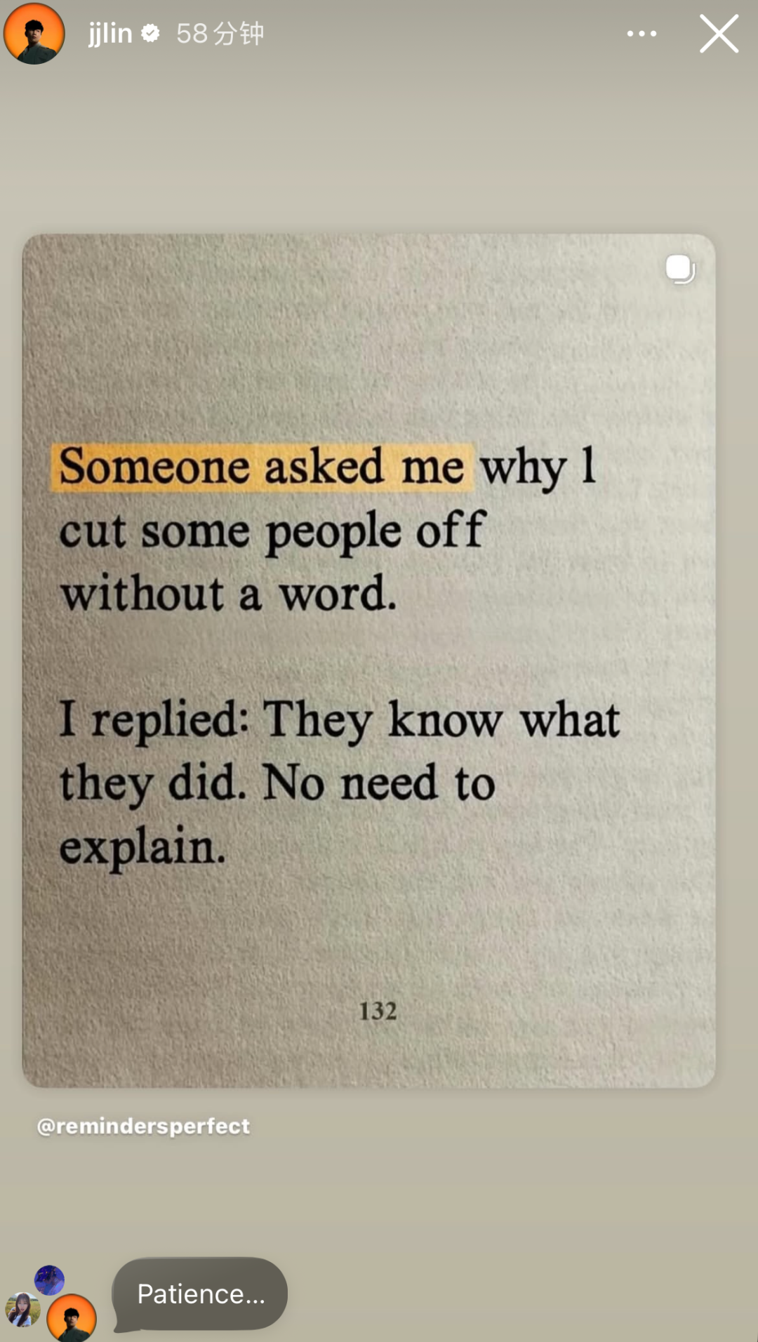 紧跟着,林俊杰更新动态疑似回应恋情,配图上写着:“有人问我为何悄无声息地与某些人断绝来往。我答道:他们心知肚明,无需多言。” 随后又在评论补充:“耐心……”