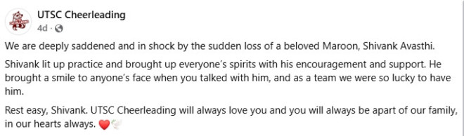 多伦多大学啦啦队社交媒体帖文中写道:“Shivank 让训练场充满了活力,他的鼓励和支持总能振奋大家的精神。只要和他说话,他就能让人露出笑容。作为一个团队,我们真的非常幸运能拥有他。”