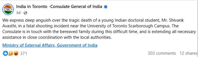 多伦多印度总领事馆(The Consulate General of India in Toronto)在圣诞节当天分享的一则Facebook帖文中,对Avasthi的不幸去世表示“深切的悲痛”,并称:“在这个艰难的时刻,领事馆正与逝者家属保持联系。”