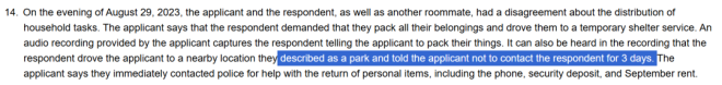 据租客Kadota主张,这是一次非法的、对方并没给予合理通知的驱逐。房东也无权扣留押金和手机,应退还自己9月份已支付的租金。房东Beaudry辩称:结束合租关系是因为租客拒绝履行约定的家务,且租客行为具有攻击性——包括“用很凶的表情瞪她”、“转身背对她、不理人”、还推过咖啡桌、弄坏了一个洗衣篮,让她感到害怕,所以要求租客立刻搬走。