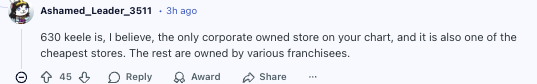“在你这张表里的门店里,630 Keele 应该是唯一一家‘公司直营店’,而且它恰好也是最便宜的之一。剩下那些都是不同加盟商开的。”