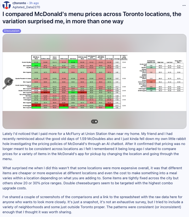 该网友表示,最初只是注意到在 Union Station 购买一杯 McFlurry 的价格明显更高,于是展开了全面对比。“让我惊讶的不是哪家贵,而是不同菜单在不同门店贵得不一样。”帖子中写道。