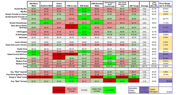 不仅逐项列出了巨无霸、双层芝士汉堡、麦旋风、薯条、鸡块等十几款经典菜单价格,还对各门店价格进行了颜色分级标注: