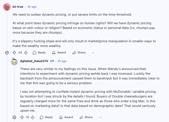 “你说的跟我对这个问题的感受非常接近。之前 Wendy’s 宣布要试水动态定价的时候,我真是气炸了。好在舆论反弹很大,最后他们只好暂时收回这个计划,但当时我一下就意识到:这事以后肯定会变成大问题。我并不是想把“即时动态定价”和麦当劳现在这种“按门店位置不同的差异定价”混为一谈,但我被自己找到的一些细节 shock 到了:买双层芝士汉堡的人,经常要为同样的薯条和饮料付出比点巨无霸的人更高的“套餐升级费”。这背后是基于什么样的市场数据?这些数据又是不是跟用户人群画像/人口统计学信息挂钩的?如果真是这样,那就太让人难受了。”