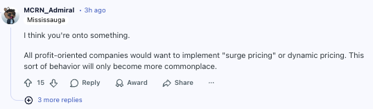 “我们真的应该把“动态定价”立法禁止,或者至少对它设一个非常严格的时间限制。动态定价在什么节点开始侵犯人权?是不是以后会按肤色、宗教来动态定价?按经济状况或者个人数据来定价?(比如:谁被算法判定为“冤大头”,就让谁多付钱。)这是一个非常滑的下坡路,只会让市场/价格被一点一点操纵,让有钱人变得更有钱。”