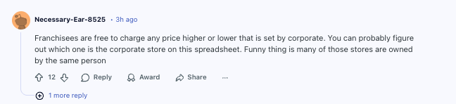 “加盟商可以在总部建议价格的基础上,自由设定更高或更低的价格。你基本上可以通过这张表猜出哪一家是公司直营店。比较好玩的是,图里好几家店其实是同一个老板开的。”