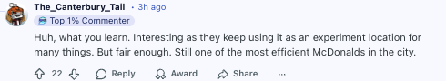 “哇,又学到一个新知识。挺有意思的是,总部老爱拿那家店做各种新东西的试验场。不过话说回来,那家确实是全城效率最高的麦当劳之一。”