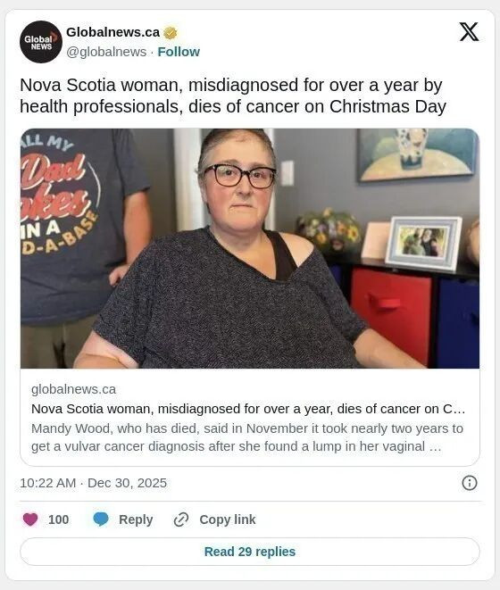 加拿大新斯科舍省资深广播人曼迪·伍德(Mandy Wood)经历长达一年多的误诊,最终确诊为癌症时已经为时已晚,她已于圣诞节当天去世,终年45岁。