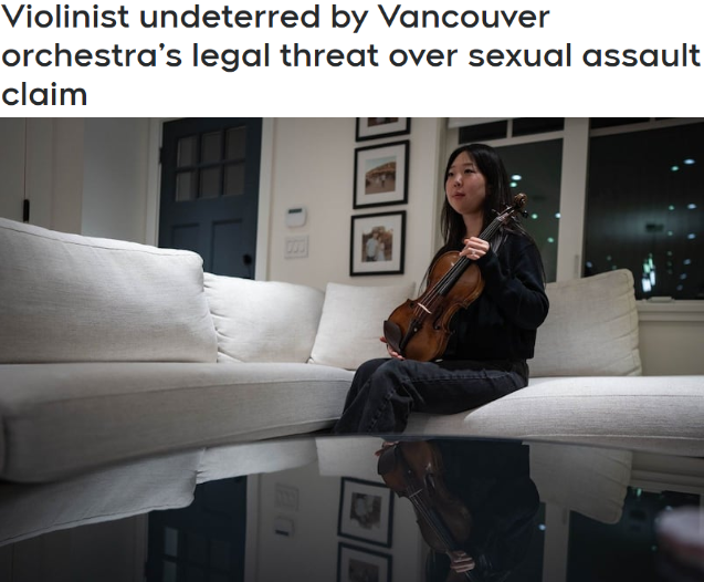 一名温哥华小提琴家表示,在她打破保密协议(NDA)、公开指控温哥华交响乐团(Vancouver Symphony Orchestra,简称 VSO)一名前高级乐手涉嫌性侵后,乐团以法律行动相威胁,但她不会因此被“恐吓”而噤声。