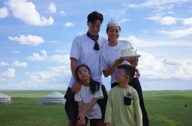 朱丹新年晒全家福 儿女戴眼镜长相很一般