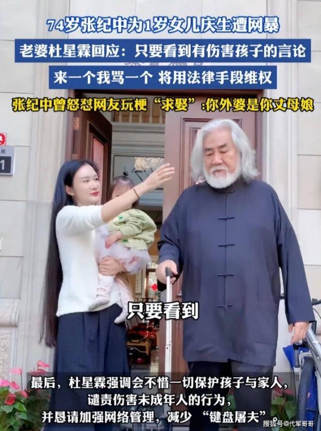 这一切的导火索,是年幼女儿遭受的恶意网暴。去年10月,张纪中分享小女儿“小龙珠”的周岁庆生视频,画面里白发苍苍的父亲怀抱襁褓婴儿,本是温情的家庭场景,评论区却沦为恶意的温床。“现在40岁,30年后娶你女儿”等带有性暗示的低俗言论铺天盖地,将攻击的矛头对准了年仅一岁的女童。