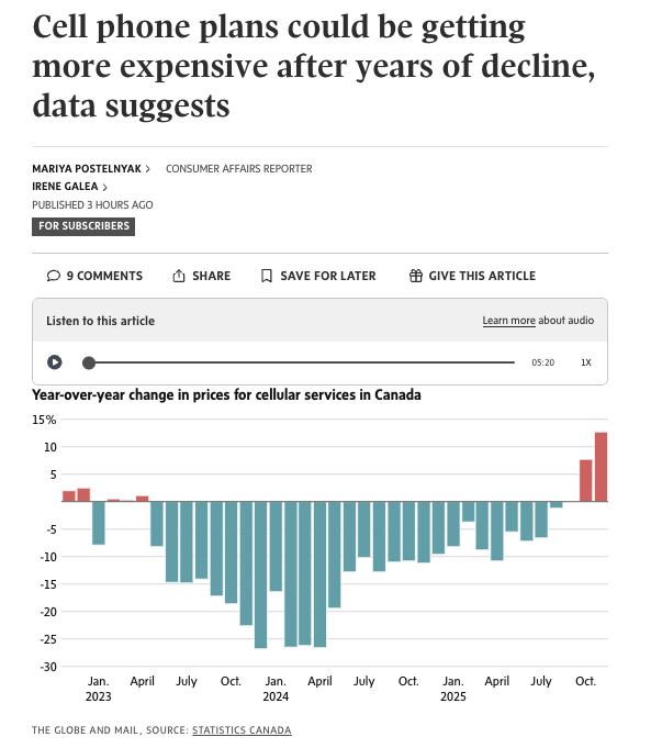 根据加拿大统计局(Statistics Canada)的数据,在经历了多年下跌后,加拿大的手机无线套餐价格可能正在变得更贵,这或许意味着一项已持续数年的趋势正在出现拐点:电信公司过去为争夺有限的新用户而激烈降价竞争到头了!