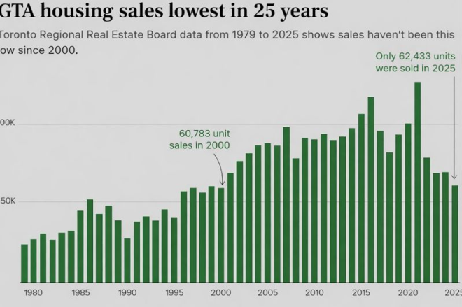 2025年,多伦多地区楼市交出了一份罕见的“低迷成绩单”。根据多伦多地产局(TRREB)发布的最新年度数据,大多伦多地区全年住宅成交量仅为62,433宗,跌至25年来最低水平。上一次成交量降至这一水平,还要追溯到2000年。