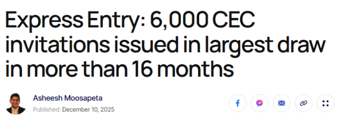 本轮共有8,000名加拿大经验类(CEC)候选人获得邀请。