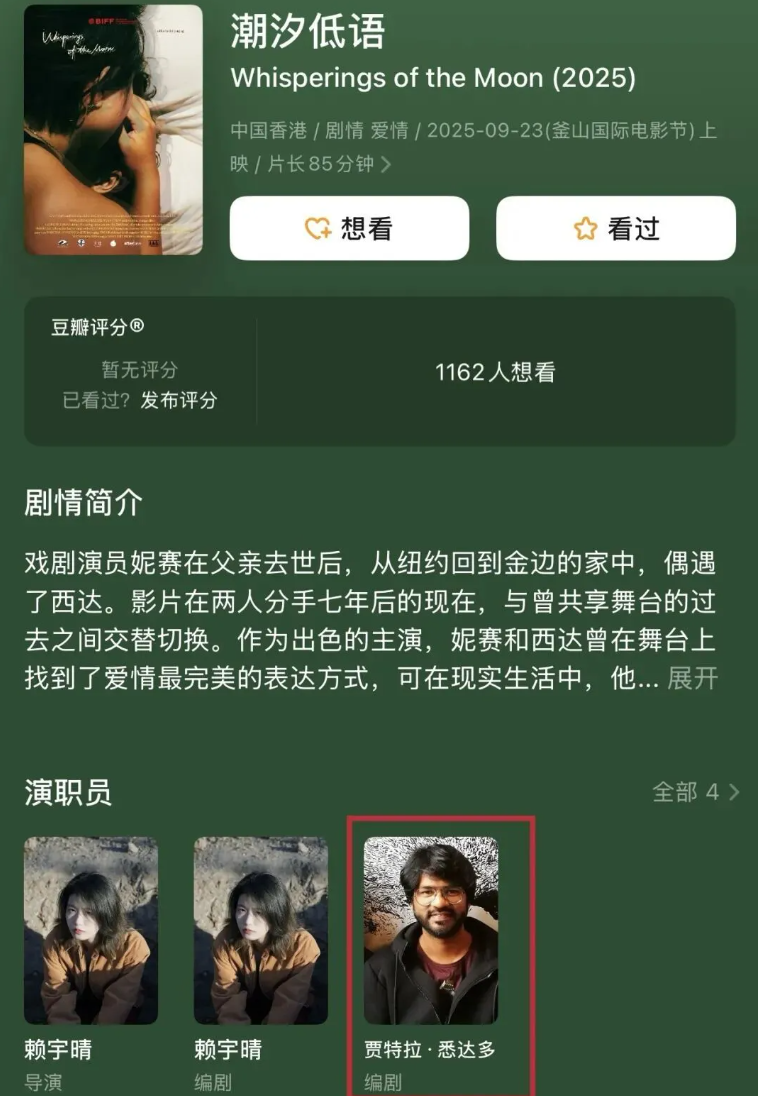 公开资料显示,印度籍嫌疑人贾特拉·悉达多为电影导演及摄影师,曾参与赖宇晴电影《潮汐低语》的联合编剧与制片工作。