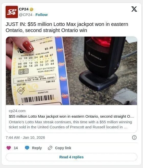 安省的 Lotto Max 连胜纪录继续延续。这次,一张价值 5500 万加元 的头奖彩票在安省东部的 Prescott 和 Russell 联合县 售出。