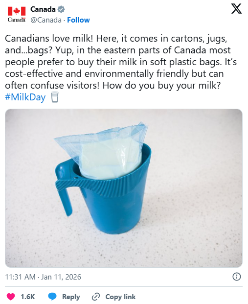 加拿大政府在 1 月 11 日(周日)庆祝“国家牛奶日”(National Milk Day)时在社交平台X上发布了一条帖子,并配上了一张壶里放着袋装牛奶的照片,画面相当“加拿大”。