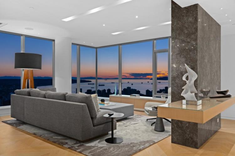 这是一套位于Fairmont Pacific Rim Residences的次顶层公寓,俯瞰温哥华港、Canada Place、狮门大桥和斯坦利公园。