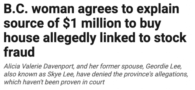 省政府提交的法庭文件表明,2017年10月30日至11月2日期间,$115万元从涉案空壳公司转出,经英国公民Roger Knox指示,电汇至西温哥华的Biancardi Law Corp.律师事务所,名义上是“贷款”给Davenport的前配偶Geordie Lee。