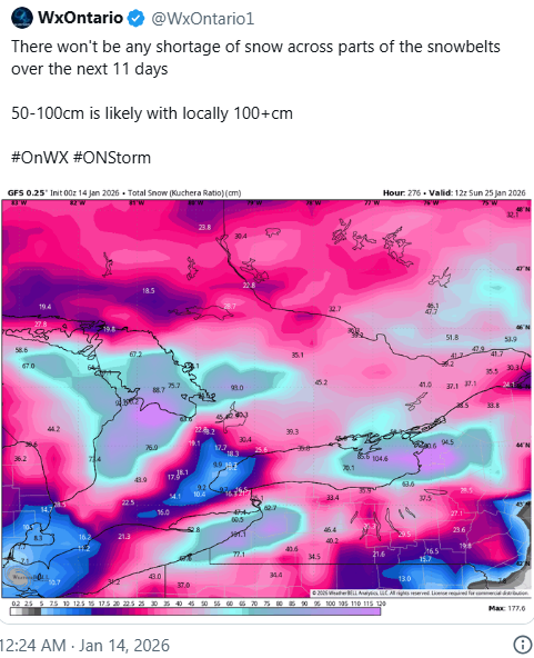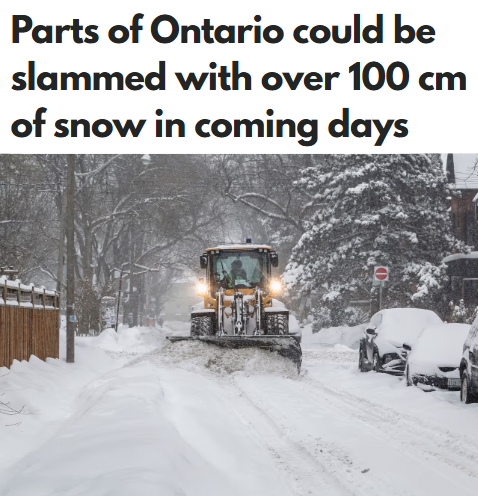 根据欧洲模型预测,安省大片地区将被厚厚的积雪覆盖数天,到1月25日,累计降雪可能达到50至100厘米。