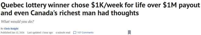 “这里既有心理问题,也有生活方式的考量,”他说。“有些人可能会非常享受突然拥有100万加元的感觉,你可以去梦幻旅行,买各种昂贵的东西。而每周1000加元,从长远看是好事,但不会让你的生活在短时间内发生巨大变化。”