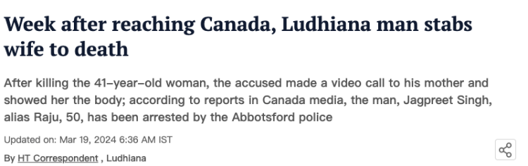 印度男子到加拿大探望妻女 刚到就8刀扎死老婆