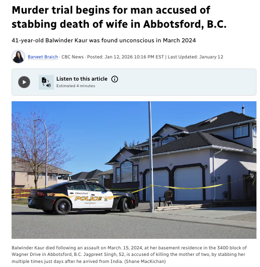 一名来自印度旁遮普邦的男子,被控在抵达加拿大仅数日后,于家中将多年未团聚的妻子残忍刺死。案件因作案时间极短、家庭背景复杂,引发当地社会与移民社区广泛关注。