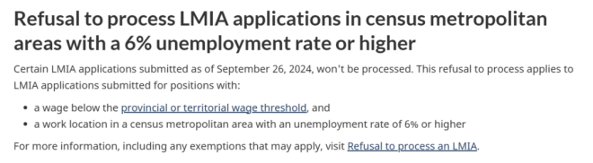 但如果你的职位属于低薪类别,而且工作地点所在地区的失业率达到或高于6%,那雇主就不能申请LMIA,除非你的职位属于豁免职业。