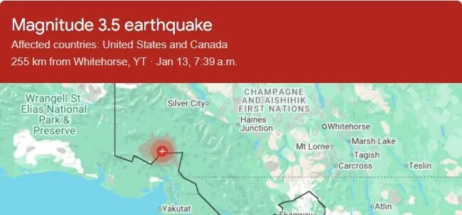 地震发生在 12 月 6 日下午 12 时 41 分,布尔沃什兰丁(Burwash Landing)和海恩斯章克申(Haines Junction)震感最强,远至 250 公里外的白马市也有明显摇晃。