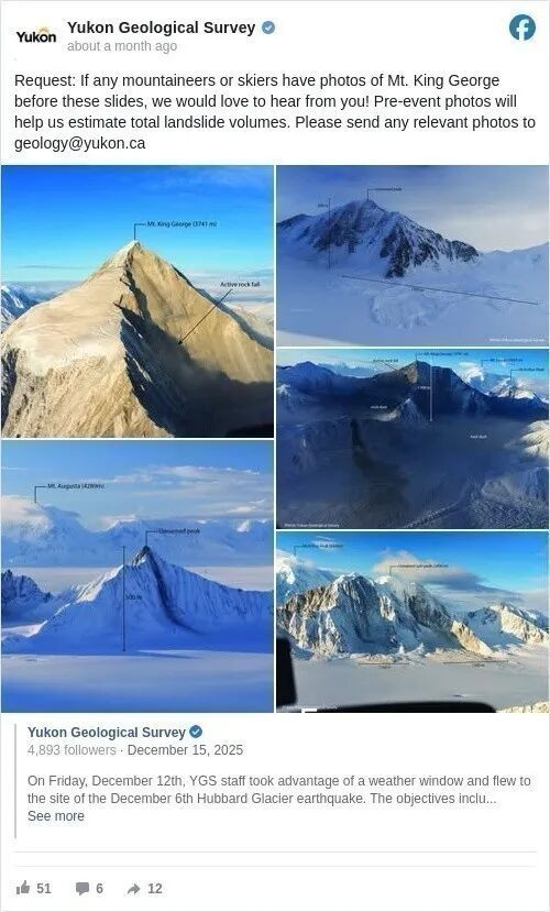 调查人员在克卢恩国家公园的乔治王山附近可以看到两处山体滑坡。据信是发生在12月的强震导致。