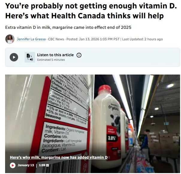 加拿大卫生部近日宣布,为改善国民维生素D摄入情况,强制要求牛奶和人造黄油的维生素D含量提高至此前的两倍以上。该政策自2025年12月31日起正式生效。