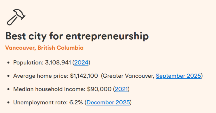 在同一份榜单中,温哥华被评为“最佳创业城市”。