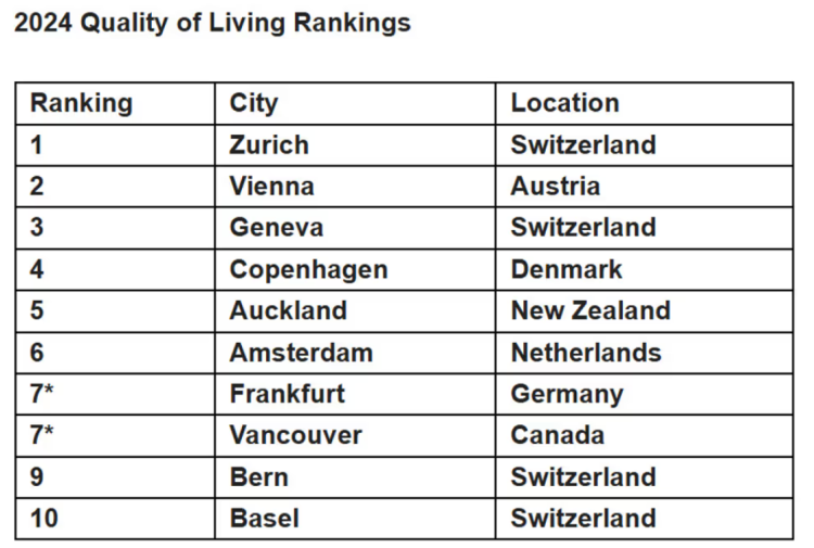 比如在2024年的Mercer生活质量调查中,它位列全球第七,是北美唯一进入前十的城市;前一年,也被评为北美最幸福城市。