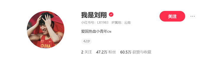 值得注意的是,刘翔的个人账号备注也写着:爱国热血小青年、中国。