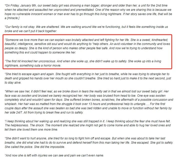 “1月9日星期五,我们亲爱的女儿遭到一个比她高大、强壮、年长的男人无端且蓄意的袭击和殴打。我们之所以分享这件事,是因为希望任何脆弱无辜的女性或男性永远不必经历这种噩梦般的遭遇。如果她的故事能够拯救一条生命,那将是一个奇迹。