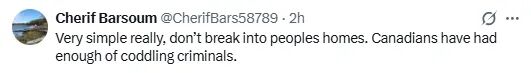 “其实很简单,不要闯入民宅。加拿大人已经受够了纵容罪犯。”